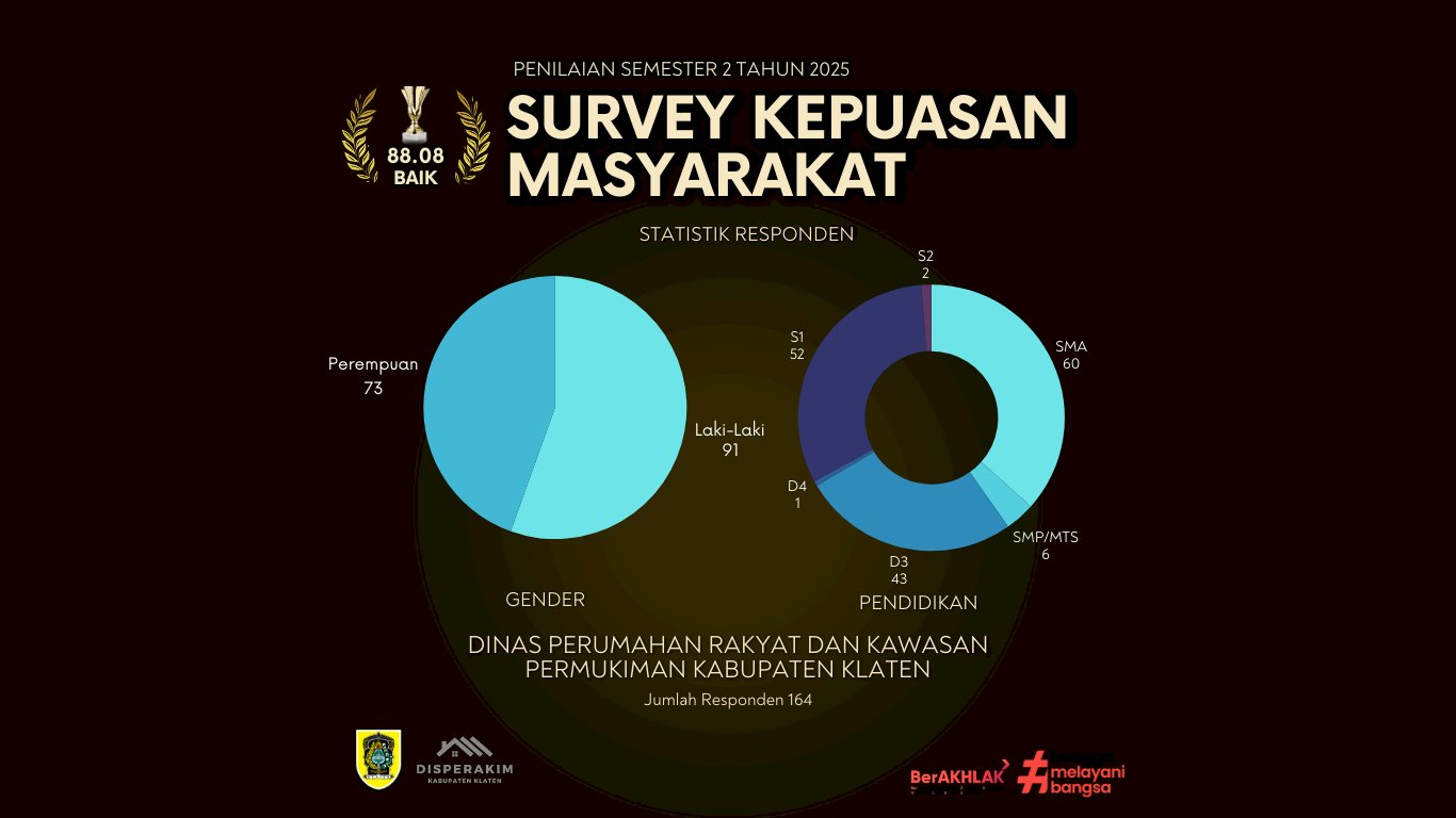 Infografis ini menampilkan hasil Survei Kepuasan Masyarakat (SKM) Semester II Tahun 2025 yang diselenggarakan oleh Dinas Perumahan Rakyat dan Kawasan Permukiman Kabupaten Klaten dengan jumlah responden sebanyak 164 orang. Berdasarkan hasil pengolahan data, diperoleh nilai SKM sebesar 88,08 dengan kategori “Baik”, yang menunjukkan tingkat kepuasan masyarakat terhadap layanan berada pada level yang positif dan stabil.